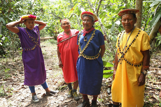 El jefe de los Secoya, una tribu indígena de la Amazonía de Ecuador, sus hijos y varios de los ancianos, fuman y charlan animadamente con un hombre blanco.